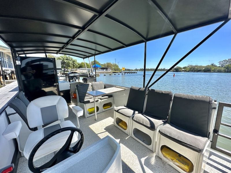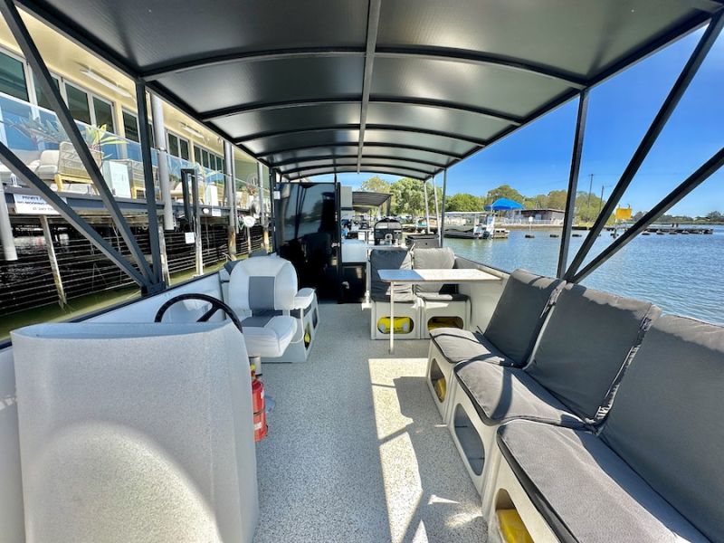 - Comfortable, spacious pontoon boat hire for up to 12 guests